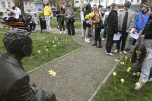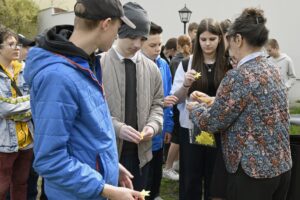 Dziś na skwerze Zygielbojma odbyło się wyjątkowe spotkanie w ramach akcji „Żonkile”. Uczennice i uczniowie z klas 7c i 8c Szkoły Podstawowej nr 8 w Chełmie, pod opieką pani Marzeny Boćwińskiej i pani Agaty Wojtasiuk, mieli okazję wysłuchać poruszających fragmentów „Pieśni o zamordowanym żydowskim narodzie” Icchaka Kacenelsona oraz listu pożegnalnego Szmula Zygielbojma. Wraz z młodzieżą na skwerze pojawiły się papierowe żółte żonkile, które symbolizują pamięć o ofiarach Holokaustu. To była ważna lekcja historii, empatii i wartości, które powinniśmy pielęgnować.