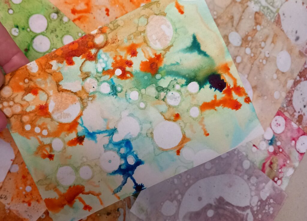 Pierwsze z nich to malowanie na mleku z użyciem barwników i oleju. To efektowna i prosta technika plastyczna. Technika ta łączy w sobie elementy sztuki, nauki i sensoryki. W pracy z najmłodszymi stwarza niepowtarzalną możliwość do rozwijania kreatywności i ekspresji artystycznej. Zachęca do wyrażania siebie poprzez zabawę barwą i ruchem. Dzięki tej technice dzieci tworzą niepowtarzalne wzory – uczą się, że sztuka może być spontaniczna i nietrwała. Eksperymentują z kolorami, kształtami i kompozycją. Ale to nie wszystko! To również świetna okazja, by wprowadzić dzieci do podstaw nauki, podczas której dzieci poznają zjawiska fizyczne obserwując napięcie powierzchniowe i reakcję chemiczną pomiędzy tłuszczem, barwnikiem a mlekiem. Eksperymentując uczą się zadawać pytania („co się stanie, jeśli…?”), stawiać hipotezy i obserwować rezultaty. Wszystko po to, aby nauczyć dzieci wnioskowania – czyli myślenia przyczynowo-skutkowego. Zapraszając do tej „zabawy” niewątpliwie wpływamy na rozwijanie percepcji wzrokowej i koncentracji. Technika ta angażuje zmysł wzroku, a także dotyku (np. przy manipulowaniu barwnikami, dmuchaniu przez słomkę). Umożliwia bezpieczne doświadczanie różnych tekstur i obserwowanie zmian w otoczeniu. Dziecko obserwuje zmieniające się wzory – ćwiczy skupienie uwagi. Rejestruje zmiany i uczy się spostrzegawczości. Rozmowy na temat obserwowanych zjawisk rozwijają słownictwo (np. kolory, ruch, zmiana, reakcja). Można łączyć je z opowiadaniem historii lub opisywaniem obrazów – rozwijając w ten sposób mimochodem narrację.