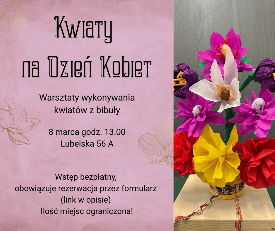 Z okazji Dnia Kobiet zapraszamy na wyjątkowe warsztaty wykonywania kwiatów z bibuły, które odbędą się 8 marca o godz. 13:00 w Dziale Etnografii przy ul. Lubelskiej 56a.
