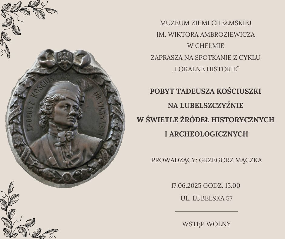 Następne spotkanie odbędzie się w przyszły wtorek, 17 czerwca o godz. 15:00 w salach muzeum przy ul. Lubelskiej 57 (Zielona Witryna). Tematem spotkania będzie „Pobyt Tadeusza Kościuszki na Lubelszczyźnie w świetle źródeł historycznych i archeologicznych„. Spotkanie poprowadzi Grzegorz Mączka.