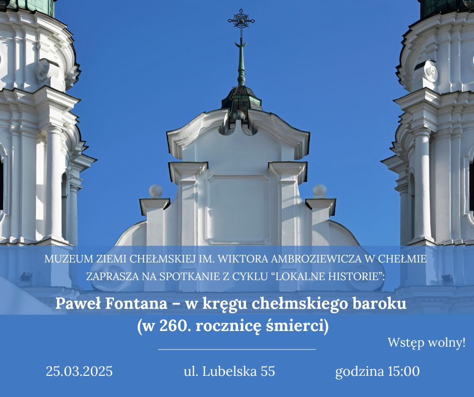 Najbliższe spotkanie odbędzie się 25 marca o godzinie 15:00 w salach Muzeum przy ul. Lubelskiej 55, i poświęcone będzie osobie Pawła Fontany – w 260. rocznicę śmierci oraz zagadnieniom chełmskiego baroku.