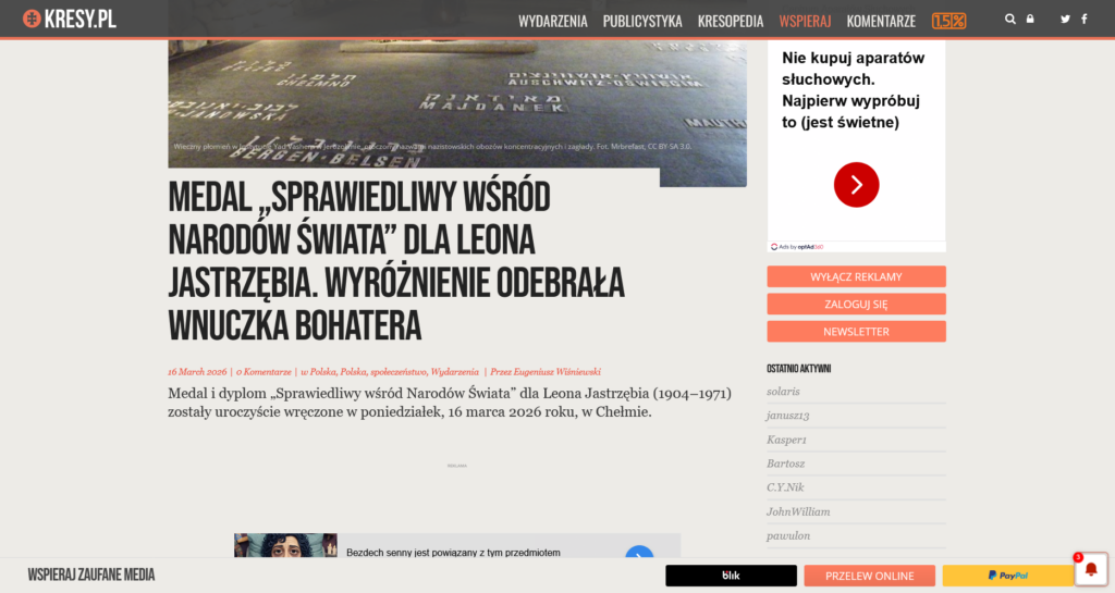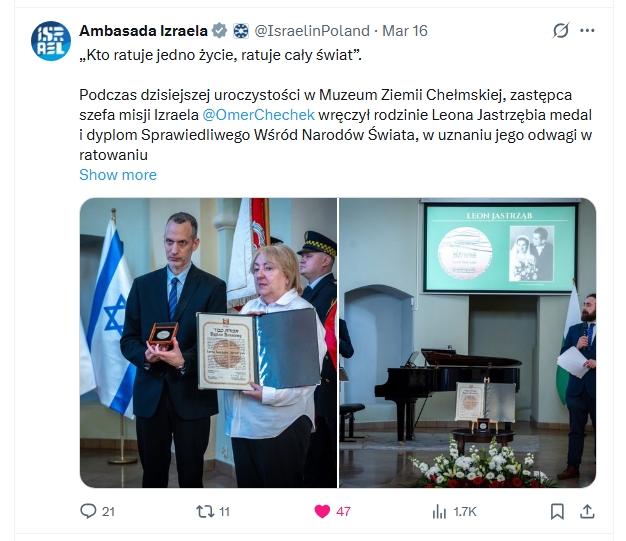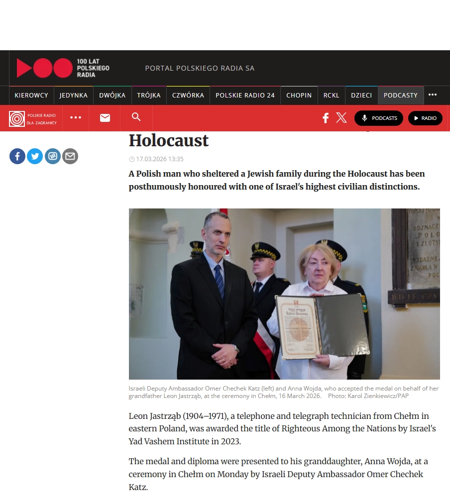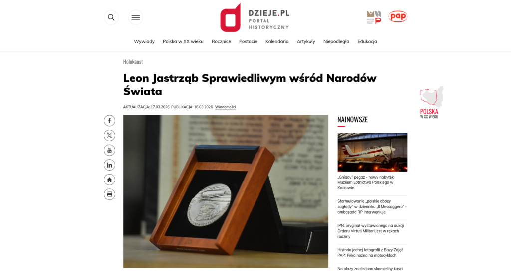 O poniedziałkowej uroczystości nadania Leonowi Jastrzębiowi odznaczenia „Sprawiedliwy wśród narodów Świata” napisało wiele portali – zebraliśmy dla Państwa kilka wycinków prasowych.
