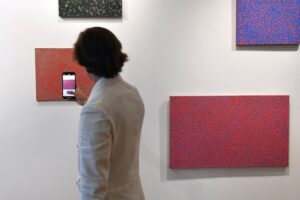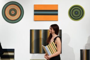 Tomasz Żołnierkiewicz (1935–2018) is a unique figure in the history of Polish painting in the second half of the 20th century. Although he taught for many years at the Warsaw Academy of Fine Arts (where he became Stefan Gierowski’s assistant in 1962), he remained on the fringes of the art world. In many ways, he lived the life of an outsider. Known as a poster artist, he lost all his prior pictorial output in a flood in the late 1980s. From then on, he set out to build or reconstitute his work across a wide variety of styles: ray paintings, dot paintings, Lettrist paintings, trompe-l’oeil, and other works make up an astonishing ensemble that seems to aim not at asserting the individuality of the artist, but simply at exploring the possibilities of painting. Żołnierkiewicz assembled these works in various configurations in his studio, which he was reluctant to let anyone visit. These resolutely anti-authoritarian works are paintings waiting to be performed. With them, the beholder plays as important a role as the artist.