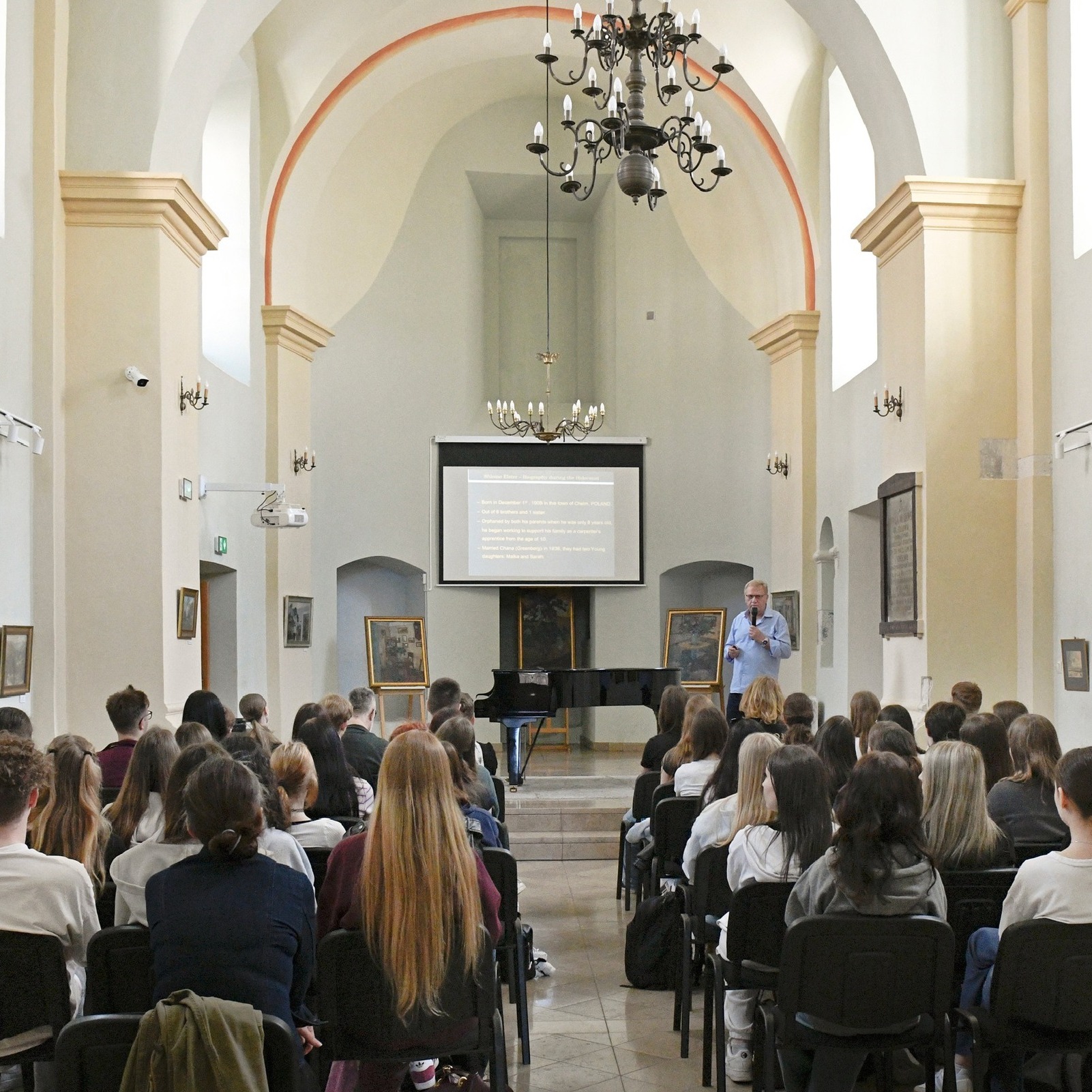 Wczoraj w naszej siedzibie mieliśmy niezwykły zaszczyt gościć Yossiego Alstera – potomka chełmskiej rodziny Alsterów, syna ocalałego z Zagłady Szlomy Alstera. Uczniowie i uczennice I Liceum Ogólnokształcącego w Chełmie mieli okazję wysłuchać poruszającej opowieści o losach jego ojca, urodzonego w Chełmie 1 grudnia 1908 roku. Szloma Alster, osierocony w wieku 8 lat, musiał wcześnie rozpocząć pracę i uczył się zawodu stolarza. W 1936 roku poślubił Hannę Grindberg. Razem doczekali się dwóch córek – Malki i Sary. Niestety, w listopadzie 1942 roku, podczas najbardziej brutalnej akcji wysiedleńczej w chełmskim getcie , stracił całą rodzinę.