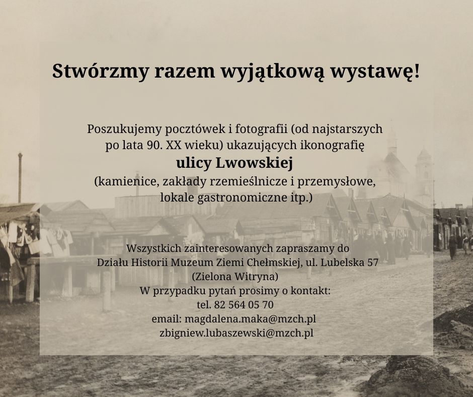 Dział Historii Muzeum Ziemi Chełmskiej im. Wiktora Ambroziewicza w Chełmie na rok 2026 planuje organizację wystawy czasowej, poświęconej historii jednej z głównych arterii komunikacyjnych Chełma – ulicy Lwowskiej. Aby przygotować wyjątkową ekspozycję zwracamy się z prośbą o wsparcie i udostępnienie archiwaliów z prywatnych zbiorów. Poszukujemy pocztówek i fotografii (od najstarszych po lata 90. XX wieku) ukazujących ikonografię ulicy Lwowskiej (kamienice, zakłady rzemieślnicze i przemysłowe, lokale gastronomiczne itp.).