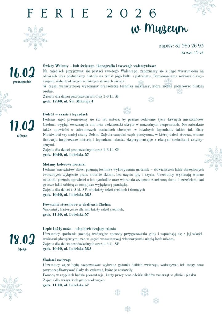 Ferie zimowe to czas odpoczynku, ale także doskonała okazja do rozwijania pasji i odkrywania nowych zainteresowań. Z myślą o osobach, które chcą spędzić ten czas w twórczy i inspirujący sposób, przygotowaliśmy bogaty program warsztatów feryjnych w muzeum.