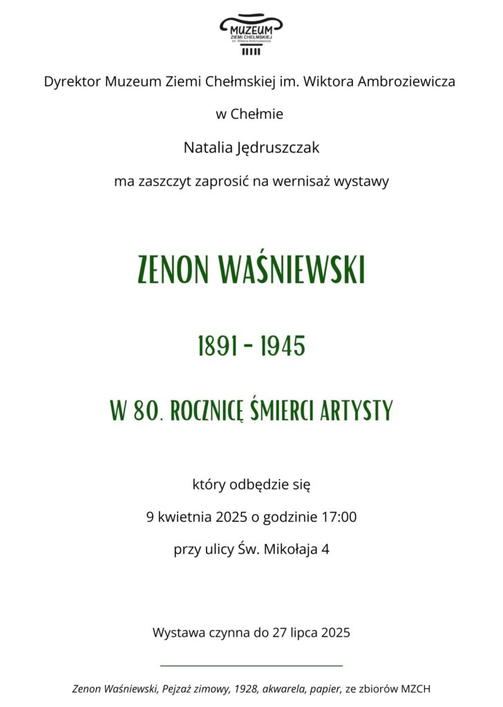 Wernisaż wystawy „Zenon Waśniewski, 1891 – 1945. W 80. rocznicę śmierci artysty” odbędzie się w środę, 9 kwietnia o godzinie 17:00 w budynku dawnej cerkwi św. Mikołaja, ul. Św. Mikołaja 4.